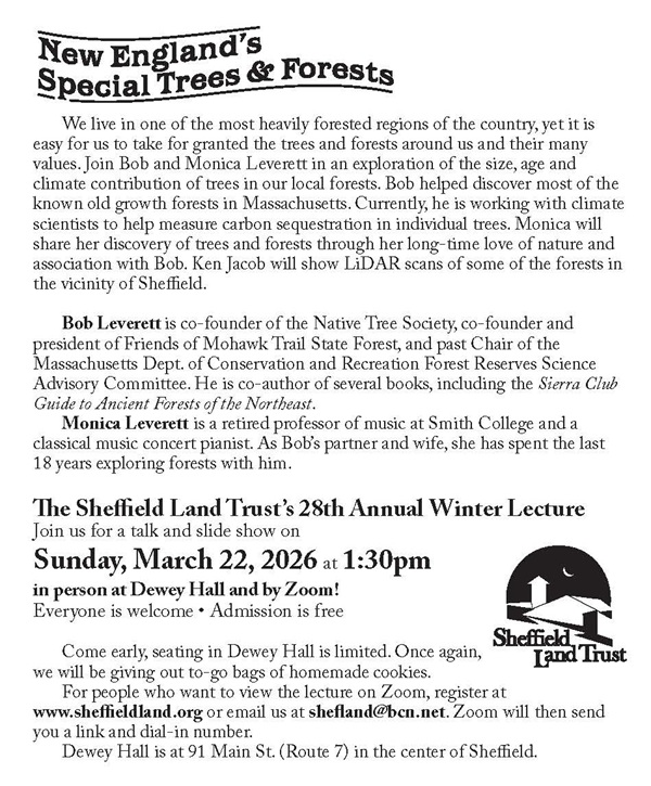 We live in one of the most heavily forested regions of the country, yet it is easy to take for granted the trees and forests around us and their many values. Bob and Monica Leverett explore the size, age, and climate contribution of trees in our local forests. Bob helped discover most of the known old growth forests in Massachusetts. Currently, he is working with climate scientists to measure carbon sequestration in individual trees. Ken Jacob shows LiDAR scans of some of the forests near Sheffield. The presentation starts at 3:32, after an introduction by Ron Yaple, the Sheffield Land Trust President.
